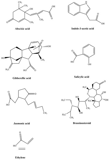 Figure 4. The molecular structures of all the mentioned phytohormones, including abscisic acid, Indole-3-acetic acid, gibberellic acid, salicylic acid, jasmonic acid, brassinosteroid, and ethylene. The figure was drawn by ChemDraw 2022 (CambridgeSoft, Cambridge, MA, USA).