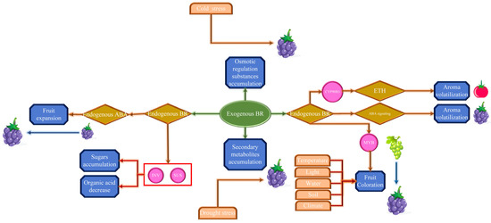 Figure 5. The effect of BR on the berry development and fruit quality improvement. Dark-blue frame displayed the main physiological activity related to fruit quality improvement, including fruit expansion, sugars accumulation, organic acid decrease, fruit coloration and aroma volatilization. The tan frame and green frame display various endogenous phytohormones, such as ABA, BR, and ETH. Incarnadine frame displayed different environmental factors, namely temperature, light, water, soil, climate, and stress. The pink frame displays structural genes and transcription factors involved in these processes, comprising INV, SUS, MYB, and CYP90B3. (→) indicated the regulating effect, while (⟞) indicated inhibiting effect.