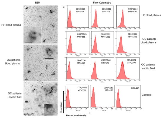 Identification of isolated exosomes. (A) TEM demonstrated the presence of exosome vesicles with typical cup-shape morphology (size bar 100 nm) and absence vesicles more than 100 nm. Arrows indicate exosomes, exosomes are on the insets. (B) Expression of CD63, CD81, and CD24 on CD9-positive exosomes of blood plasma of HFs, blood plasma, and ascites of OC patients. For flow cytometry representative median fluorescence intensity (MFI) are shown (see Table S1 for details). Each study is done in triplets. For isotype controls (histograms in the center and on the left), CD9-labeled beads-exosome complexes were incubated with FITC mouse IgG1, k Isotype control (Cat N555748, BD, Heidelberg, Germany) or FITC mouse IgG2a, k Isotype control (Cat N553456, BD, Heidelberg, Germany). For the negative control (histogram on the right), latex particles labeled with CD9 antibodies were incubated with FITC labeled antibodies anti-CD63, anti-CD81, and anti-CD24 antibody. One of the representative negative controls is shown.