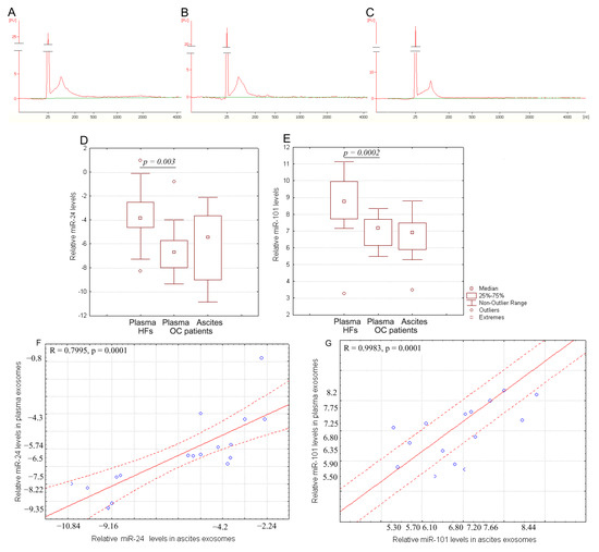 Bioanalyzer trace analysis revealed abundant miRNA presence in the exosomes isolated from the plasma and ascites samples (Figure 3A–C). The diagnostic potential of exosomal RNA was tested by stem-loop qRT-TaqMan PCR of miR-101 and miR-24-3p, which were all down-regulated in highly metastatic human carcinoma patient tissues including OC [18]. Since the miR-16-5p expression was stable and reproducible, it was chosen as an endogenous control to normalize the miRNA expression [22,23,24]. Indeed, there was no statistical difference in the level of miR-16 from the exosomal samples from HFs and OC patients (Ct 32.09 and Ct 31.89, correspondingly). For microRNAs, qRT-PCR assays with a working range of 28.15–34.35 threshold cycles (Ct) of PCR were used. Non-template controls produced no signal or were at least seven cycles away from the minimum detectable amount of specific template. All the reported data were obtained using RNA samples that produced Ct values within the working range of the systems. Spike-in control (cel-miR-39) was detected in all the samples at 25 ± 1 Ct. Data on the miRNA relative expression in samples of exosomes from of HFs and OC patients are presented in Figure 3D,E.