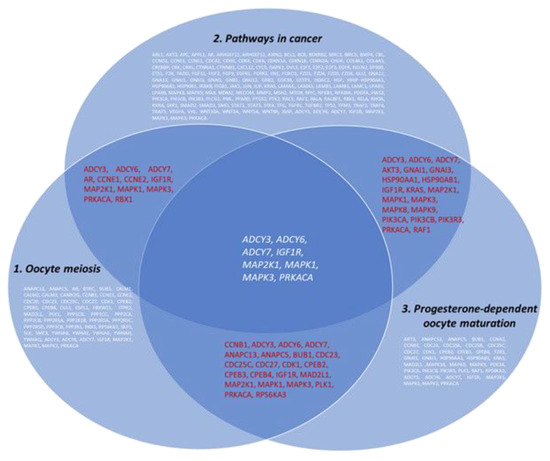 The participation of selected miRNAs in the development of epithelial OC was analyzed using the DIANA database (http://dianalab.e-ce.uth.gr/, accessed on 30 May 2022). It was revealed that microRNA -24-3p and -101 are involved in the OC development, in particular, in oocyte meiosis and progesterone-dependent maturation of oocytes, regulating 8 genes (Figure 5).