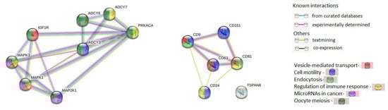 The interactions of 8 proteins (ADCY3, ADCY6, ADCY7, IGF1R, MAP2K1, MAPK1, MAPK3, and PRKACA) encoded by the genes regulated by selected miRNAs involved in oocyte meiosis, progesterone-dependent oocyte maturation and the cancer pathways and 6 exosomal proteins (CD9, CD24, CD63, CD81, CD151, and TSPAN8) were analyzed using the STRING database (string-db.org). The complicated and closed network organized by these genes and the interactions between them are presented in Figure 6. It was found that genes regulated by miR-24 and miR-101 did not interact with tetraspanin genes. Nevertheless, all genes analyzed are involved in the same processes. In particular, six proteins are involved in transportand regulation of cell motility and immune responses, and four proteins in endocytosis. It should be noted that 13 out of 14 proteins are involved in common pathways, with the exception of Tspan8.