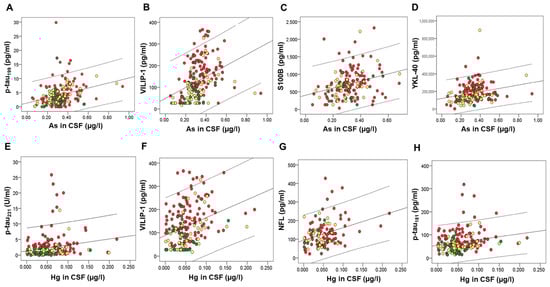Correlation of CSF biomarkers of AD with As (A–D) and Hg (E–H) measured in CSF. Red circles represent AD patients, yellow circles represent MCI patients, while green circles represent healthy controls.
