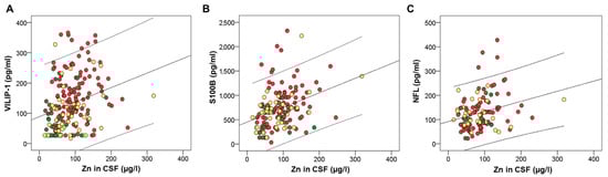 Correlation of CSF biomarkers VILIP-1 (A), S100B (B), and NFL (C) of AD with Zn measured in CSF. Red circles represent AD patients, yellow circles represent MCI patients, while green circles represent healthy controls.