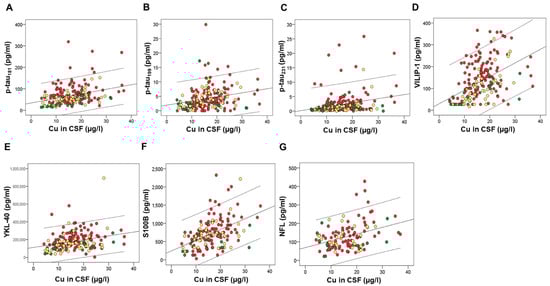 Correlation of CSF biomarkers of AD – p-tau181 (A), ptau199 (B), ptau231 (C), VILIP-1 (D), YKL-40 (E), S100B (F), and NFL (G) with Cu measured in CSF. Red circles represent AD patients, yellow circles represent MCI patients, while green circles represent healthy controls.
