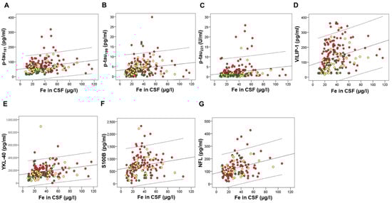 Correlation of CSF biomarkers of AD – p-tau181 (A), ptau199 (B), ptau231 (C), VILIP-1 (D), YKL-40 (E), S100B (F), and NFL (G) with Fe measured in CSF. Red circles represent AD patients, yellow circles represent MCI patients, while green circles represent healthy controls.