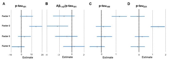 Association of CSF AD biomarkers – p-tau181 (A), Aβ1–42/p-tau181 ratio (B), p-tau199 (C), and p-tau231 (D) with CSF macro- and microelement groups revealed by PCA. Effect sizes and 95% confidence intervals are given by linear regression analysis (statistically significant factors are considered those represented with horizontal lines that do not intersect with the vertical line at 0). Factor 1; CSF As, Ba, Ca, Co, Cu, Fe, K, Mg, Mn, Na, Ni, S, Se, Sr, Tl, and Zn; Factor 2; CSF Al, Cd, and Pb; Factor 3; CSF B and Li; Factor 5; CSF Hg and Mo.