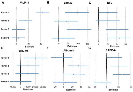 Association of CSF AD biomarkers – VILIP-1 (A), S100B (B), NFL (C), YKL-40 (E), albumin (F), and PAPP-A (G) with CSF macro- and microelement groups revealed by PCA. Effect sizes and 95% confidence intervals are given by linear regression analysis (statistically significant factors are considered those represented with horizontal lines that do not intersect with the vertical line at 0). Factor 1; CSF As, Ba, Ca, Co, Cu, Fe, K, Mg, Mn, Na, Ni, S, Se, Sr, Tl, and Zn; Factor 2; CSF Al, Cd, and Pb; Factor 3; CSF B and Li; Factor 5; CSF Hg and Mo.