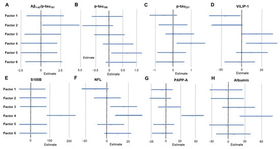 Association of CSF AD biomarkers – Aβ1–42/p-tau181 ratio (A), p-tau199 (B), p-tau231 (C), VILIP-1 (D), S100B (E), NFL (F), PAPP-A (G), and albumin (H) with plasma macro- and microelement groups revealed by the PCA. Effect sizes and 95% confidence intervals are given by linear regression analysis (statistically significant factors are considered those represented with horizontal lines that do not intersect with the vertical line at 0). Factor 1; plasma Ca, Co, Cu, Mg, Mn, Na, P, S, Se, Tl, and Zn; Factor 2; plasma B, Cd, Li, Mo, and Pb; Factor 3; plasma As and Hg; Factor 4; plasma Ni; Factor 5; plasma Sr; Factor 6; plasma Fe.