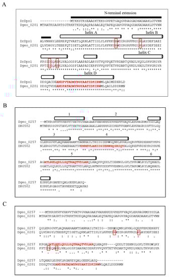 Comparison of amino acid sequences between DrDps1 and DgDps1 (Dgeo_0281) (A), a putative Dps Dgeo_0257 of D. geothermalis and a hypothetic protein DR0582 of D. radiodurans with 65.5% identity (B) and between DgDps1 and Dgeo_0257 with 11.5% identity (C). The secondary structure of the helix (A,B) and the ferroxidase active centre of DgDps1 with red boxes are marked (A,C). The conserved ferroxidase active centre is missing in Dgeo_0257 (C). Red words indicate the DNA-binding domains (HTH) predicted by Prabi (https://npsa-prabi.ibcp.fr/ accessed on 10 June 2022). The secondary structure of Dgeo_0257 was predicted by Jpred 4 (http://www.compbio. dundee.ac.uk/jpred4/ accessed on 1 June 2022).