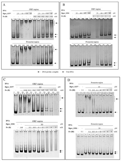 EMSA of Dgeo_0257 (A) and DgDps1 (B) on both promoter and ORF regions with increasing protein concentration. Dgeo_0257 and DgDps1 were treated with 0.2 mM and 1.0 mM ferrous ion concentration at lanes 6–10, respectively. Lane 1, free DNA; lanes 2–5, increased amounts of purified Dgeo_0257 and DgDps1 proteins (2.5–10 µM and 15–60 µM, respectively). Comparison of differential concentrations of ferrous ions (C) and ferric ions (D) on ORF and promoter regions, respectively.