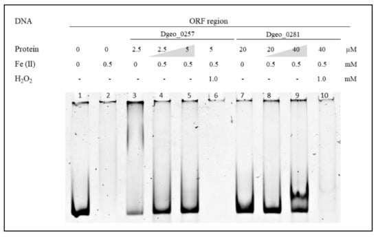 DNA–Dps complex formation and DNA protection analysis from iron treatment and Fenton reactions. Lane 1, free DNA; lane 2, only 0.5 mM Fe2+; lanes 3 and 7, both proteins added with different amounts; lanes 4, 5, 8, and 9, increased Dgeo_0257 and DgDps1 proteins with ferrous ions at 0.5 mM; lanes 6 and 10, Fenton reaction samples with 1.0 mM H2O2.
