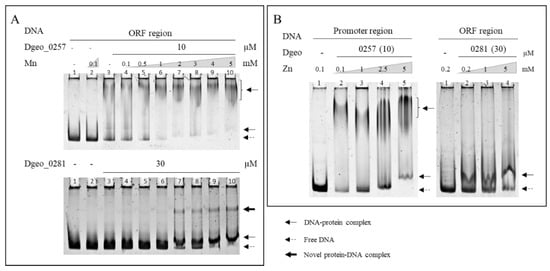 EMSA of Dgeo_0257 and DgDps1 maintaining a protein concentration of 10 µM and 30 µM, respectively, while increasing the metal ion concentration of manganese (A) and zinc (B).