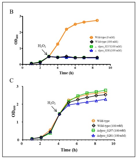 (A) Viability against H2O2 treatment at 80, 100, and 120 mM for 1 h was tested. Comparison of growth patterns among wild-type, Δdgeo_0257, and Δdgeo_0281 mutant strains. Growth was completely inhibited by 100 mM H2O2 at two different OD600 values of 0.5 (B) and 1.47 (C) in wild-type and Δdgeo_0257 and Δdgeo_0281 mutant strains. The OD values were determined by direct measurement.