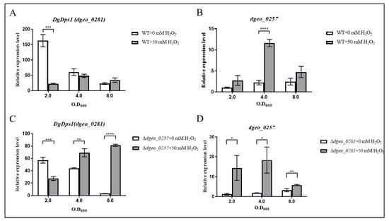 Expression levels of both DgDps1 (dgeo_0281) (A,C) and a putative Dps (dgeo_0257) (B,D) in the presence or absence of 50 mM H2O2 in the wild-type strain and in Δdgeo_0257 and Δdgeo_0281 mutants at three different growth phases, OD600 2.0, 4.0, and 8.0, by qRT-PCR analysis, respectively. The probability t-test was considered significant at p < 0.05 (*), p < 0.01 (**), p < 0.001 (***), and p < 0.0001 (****).