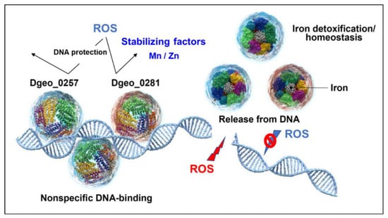 Regulatory scheme of DgDps1 (Dgeo_0281) and Dgeo_0257. Both DgDps1 and Dgeo_0257 proteins act as DNA protectants under oxidative stress conditions. DNA-binding stability was enhanced by Mn and Zn ions. When Dps proteins were released from DNA, iron ions were sequestrated to repress the Fenton reaction. However, free DNA damaged by ROS results in DNA cleavage.