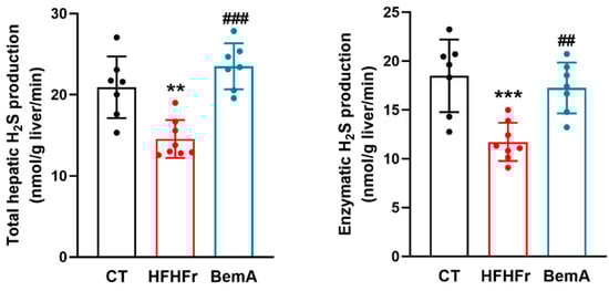 Effect of HFHFr supplementation and BemA treatment on Sprague-Dawley female rats’ liver total and enzymatic H2S production. Bar plots show liver total and enzymatic H2S production as mean ± SD, as well as individual values from 7–8 tissue samples, corresponding to the three experimental groups studied: CT (control), HFHFr (high-fat high-fructose), and BemA (HFHFr treated with BemA) female Sprague-Dawley rats. ** p < 0.01, *** p < 0.001 vs. CT; ## p < 0.01, ### p < 0.001 vs. HFHFr.