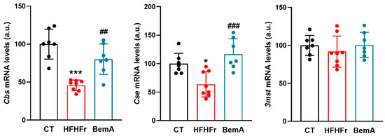 Relative expression of the three enzymes involved in the release of H2S in liver tissue: cbs, cse, and 3mst. Bar plots show the relative mRNA levels of cbs, cse, and 3mst genes as mean ± SD, as well as individual values from 7-8 tissue samples, corresponding to the three experimental groups studied: CT (control), HFHFr (high-fat high-fructose), and BemA (HFHFr treated with BemA) female Sprague-Dawley rats. * p < 0.05, *** p < 0.001, vs. CT; ## p < 0.01, ### p < 0.001 vs. HFHFr.