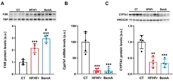 Effect of Bempedoic acid on nuclear FXR protein levels and Cyp7A1 expression in liver samples. Bar plots show (A) liver FXR protein levels in nuclear extracts from control (CT), high-fat high-fructose (HFHFr), and bempedoic acid (BemA)-treated rats. The results are expressed as the mean ± SD of four pooled samples, obtained by mixing equal amounts of tissue from two rats, for each condition. (B) Bar plots show mRNA and (C) protein levels of Cyp7A1 in liver samples from CT, HFHFr, and BemA rats. The results are expressed as the mean ± SD of five samples (mRNA) or four pooled samples (WB), obtained by mixing equal amounts of tissue from two rats, for each condition. On the upper side of the figure, representative western blot bands corresponding to the three different study groups are shown. a.u.: arbitrary units. Data were analyzed by one-way ANOVA followed by Tukey’s post-hoc test. ** p < 0.01, *** p < 0.001 vs. CT; # p < 0.05 vs. HFHFr.