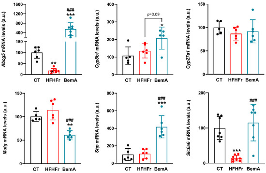 Relative expression of several genes under FXR transcriptional control in liver samples. Bar plots show the relative mRNA levels of abcg5, cyp8b1, cyp27a1, mafg, shp, and slc6a6 genes as mean ± SD, as well as individual values from 5-8 tissue samples, corresponding to the three experimental groups studied: CT (control), HFHFr (high-fat high-fructose), and BemA (HFHFr treated with BemA) female Sprague-Dawley rats. * p < 0.05, ** p < 0.01, *** p < 0.001, vs. CT; ### p < 0.001 vs. HFHFr.