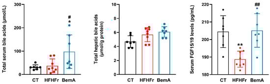 Effect of HFHFr supplementation and BemA treatment on Sprague-Dawley female rats’ serum and liver bile acid concentrations and serum FGF15/19 levels. Bar plots show concentrations as mean ± SD, as well as individual values from 7–8 samples, corresponding to the three experimental groups studied: CT (control), HFHFr (high-fat high-fructose), and BemA (HFHFr treated with BemA) female Sprague-Dawley rats. * p < 0.05, ** p < 0.01 vs. CT; # p < 0.05, ## p < 0.01 vs. HFHFr.