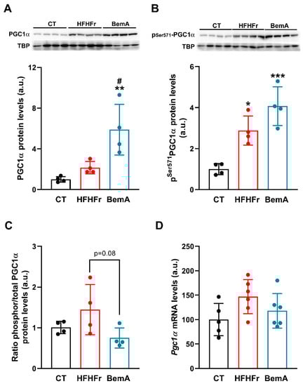 2.3. BemA Administration Improves the Ratio of Phophor-Ser571/Total PGC1α (Peroxisome Proliferator Activator Receptor Gamma Coactivator-1α) in the Livers of HFHFr-Fed Female Sprague-Dawley Rats