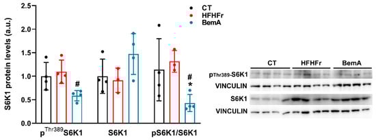 Finally, we determined the liver expression of several kinases that can reportedly phosphorylate PGC1α at the Ser571 position, such as Akt serine/threonine kinase, CDC-like kinase 2, and S6K1 (ribosomal protein S6 kinase beta-1) [20]. Of these, only S6K1 activity, indirectly ascertained through its degree of phosphorylation at the Thr389 position (see Figure 7), was in accordance with the pattern of phophor-Ser571 PGC1α expression, with its phosphorylated, active form being significantly reduced (×0.5 vs. HFHFr) by BemA administration.