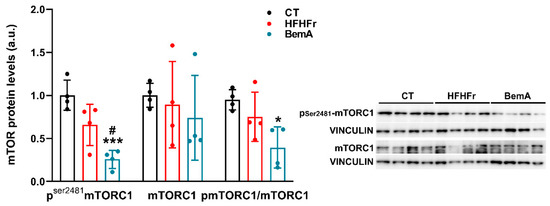 S6K1 is downstream of mTORC1 signaling [21]. Thus, we indirectly determined, in the same liver samples, the degree of mTORC1 activation by comparing the relative amounts of phophor-Ser2481 mTORC1. As can be seen in Figure 8, the HFHFr diet did not modify the amount of phophor-Ser2481 mTORC1 in the liver samples with respect to control values. BemA treatment significantly reduced mTORC1 phosphorylation compared to the control (×0.24) and HFHFr liver samples (×0.39), which is consistent with the abovementioned reduction in the levels of phosphor-Thr389 S6K1.