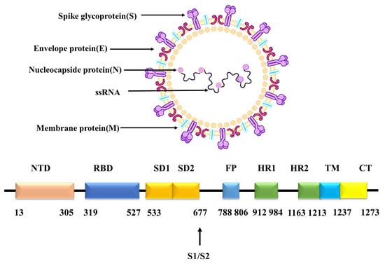 SARS-CoV-2 is a single-stranded RNA virus and is a new member of the coronavirus family, with a length of 29 kb [2]. It is highly infectious with low immunity. High infectiousness is the main cause of the SARS-CoV-2 pandemic. During the infection of SARS-CoV-2, the binding of spike glycoprotein (S protein) of SARS-CoV-2 to the angiotensin converting enzyme2 (ACE2) in host cells is the first and critical step [3]. S protein exists mainly as a trimer in vivo with its highly glycosylated state. The monomer of S protein can be divided into the S1 subunit and the S2 subunit. The S1 subunit includes the N-terminal structural domain (NTD) and the receptor binding domain (RBD). For the RBD region, it is the reported key domain for the binding of S protein to ACE2. The S2 subunit contains the fusion peptide region (FP), the heptapeptide repeat sequence region HR1 and HR2, the transmembrane region (TM) and the cytoplasmic structural domain (CP) [4]. The cartoon model of the structure of SARS-CoV-2 is shown in Figure 1, which was drawn with BioRender on 30 June 2022 (https://app.biorender.com/biorender-templates). Among them, the RBD is the main epitope of SARS-CoV-2 that induces neutralizing antibody and is usually used as the main antigenic target for drug design [5].