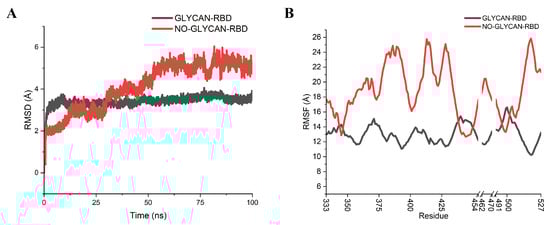RMSD, RMSF analysis of GLYCAN and NO-GLYCAN RBD regions. GLYCAN system in black; NO-GLYCAN system in red; (A) RMSD analysis of antigenic RBD; (B) RMSF of antigenic RBD.