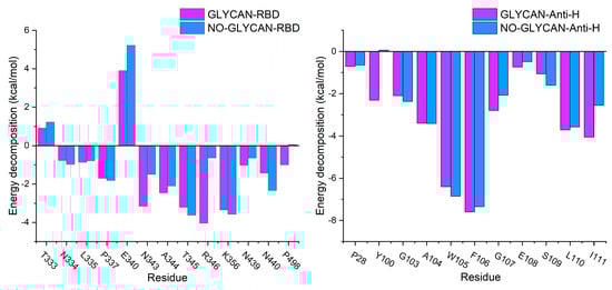 Furthermore, to investigate the key residues in antigen–antibody interactions, We performed energy decomposition of the binding free energy, as shown in Figure 3. We found that the energy contribution of key residues in the GLYCAN system was generally decreased in the NO-GLYCAN system. The results revealed that the key residues of interacting antigens were mainly distributed in the regions of T333-K356 and N439-L440, including residues N334, L335, P337, N343, A344, T345, R346, N439 and L440. The key residues of S309 are mainly distributed in the CDR1 region of P28-Y32 and the CDR3 region of Y100-I111 in the heavy chain. Key residues in the antibody are located in the heavy chain, including P28, Y100, G103, A104, W105, F106, G107, S109, L110 and I111. Therefore, we speculate that this part of the residues has an important role in glycan-promoted interactions.