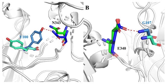 Since hydrogen bonding (H-bond) plays an important role in antigen–antibody binding, to investigate the interaction between antigen and antibody we performed hydrogen bonding network analysis [13], as shown in Table 2. The results revealed that the H-bond interactions in the NO-GLYCAN showed a decreasing trend. The occupancy of H-bond in the NO-GLYCAN system is significantly lower than that of GLYCAN, especially for H-bonds of N343-Y100 and G107-E340, with the former occupancy decreasing from 41.33% to 2.9% and the latter decreasing from 39.33% to 17.88%. As shown in Figure 4, there is an obvious torsion for the aromatic ring of Y100 in the NO-GLYCAN, which makes it difficult to form H-bond with N343. While for the H-bond G107-E340, a slight angular deflection was also observed for the side-chain of E340 in the NO-GLYCAN, explaining the reduced H-bond occupancy of G107-E340.
