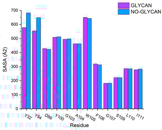 Based on these findings, we further performed solvent-accessible surface area calculations for the hot-spot residues. We found that the major changes in solvent-accessible surface area were concentrated on residues Y32 and Y54, which were located in the heavy chain of the antibody. For residue Y32, the solvent accessible surface increased from 577.9995 Å in GLYCAN to 682.484 Å in NO-GLYCAN. For residue Y54, it increased from 554.0865 Å in GLYCAN to 649.0179 Å, as shown in Figure 5. The increased solvent-accessible surface represents an increase in the contact area of the probe water molecule with the antigen surface, which means that the area of antigen–antibody contact will be reduced. Therefore, we hypothesize that the presence of glycans causes residues Y32 and Y54 of the heavy chain to be structurally closer to the antigen, resulting in a tighter binding to the antigen and thus a change in the solvent-accessible surface area.