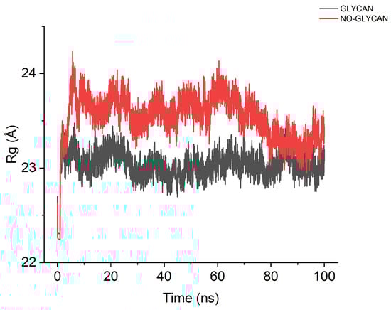 Based on the above results, we speculate that the presence of glycans causes a large change in the conformation of the GLYCAN, and this change facilitates antigen–antibody binding. To verify this speculation, we performed a radius of gyration analysis for GLYCAN and NO-GLYCAN, as shown in Figure 6. The radius of gyration of NO-GLYCAN is larger than that of GLYCAN, indicating that the structure of GLYCAN is more compact than that of NO-GLYCAN, and the binding between antigen and antibody is tighter.