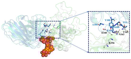 In order to investigate the difference of the structural changes between the GLYCAN and the NO-GLYCAN, we further performed a clustering analysis based on the equilibrium trajectories (80–100 ns), and the obtained representative conformations were used to perform a superposition analysis, as shown in Figure 7. We found that on the antigen–antibody contact surface, partial residue of CDR3 in the heavy chain of GLYCAN was closer to the RBD region of L335-E340 than that of NO-GLYCAN. Among them, Y100-T103 on CDR3 and L335-E340 on RBD have the most structural changes in the region, as shown in Figure 8A. Since the glycan is located at the interaction surface of the RBD with the heavy chain of antibody and is directly linked to the residue N334 of RBD (Figure 7), we believe that the steric hindrance of RBD surface glycans plays the role of “wedge”. The steric hindrance brings the L335-E340 residue region of RBD structurally closer to the CDR3 region of the heavy chain [14,15]. L335-E340 undergoes a strong hydrogen bonding interaction network with residues of CDR3. In Figure 8B, L335-E340 is surrounded by CDR3 and residues in CDR3 form five hydrogen bonds with E340. This also increases the contact surface of residues in the CDR3 region with the RBD, which allows for better interaction with the antibody. While in the NO-GLYCAN system, an obvious twist of Y100 is observed, and the twist of Y100 causes the L335-E340 to no longer be surrounded by CDR3 (Figure 8C). Moreover, the H-bonds between E340 and G107, E108 were broken. Taken together, the glycans at the surface of RBD can enhance the interaction between antibody and RBD of the S protein.