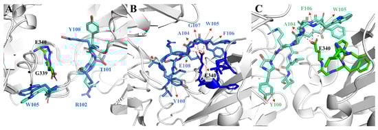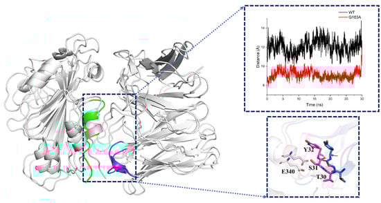 To verify the structural changes, we performed a cluster analysis of the equilibrium trajectories (70–100 ns) for each system to obtain the representative conformation of each system. Among the superimposed conformations of each mutant system and the wild-type system, we found that only mutant G103A showed significant changes in the antigen–antibody binding surface compared to the structure of WT, including segment L335-K356 of the antigen and P28-Y32 of the heavy chain of the antibody, as shown in Figure 10. By calculating the distance of antigen L335-K356 and the heavy chain of antibody P28-Y32 [20,21], it can be found that the distance between antigen and antibody residues of mutant G103A was significantly reduced, with the most significant changes in E340 in the RBD region and S31 and Y32 in the heavy chain of the antibody, which explained why hydrogen bonding interactions were enhanced in this region.
