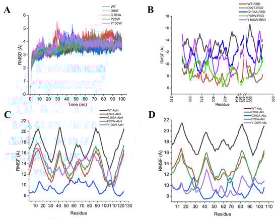 In order to further validate the predicted results, we performed molecular dynamics simulations on the mutant antibodies P28W, G103A, Y100W and D99T [18,19]. From the RMSD curves in Figure 9A, we can find that each system reached equilibrium after 40 ns in the RMSF analysis (Figure 9B–D). By comparing the low peaks with those of WT, we found that the residue region of low peak for the Y100W mutant antibody was almost unchanged, and only the value of the P28-Y32 region was decreased. In the rest of the mutant antibodies, all of them were reduced, with the G103A mutant showing the largest change.