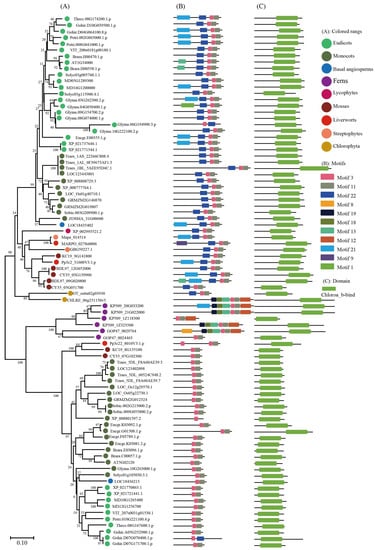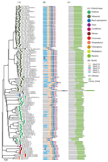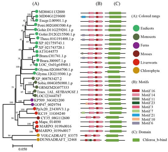 Most research on plant LHCs has focused on the Lhc subfamilies Lhca and Lhcb, which play important functions in PSI (photosystem I) and PSII (photosystem II) [9], respectively. The combination of LHC protein with antenna pigments chlorophyll and carotenoids enhances the light capturing ability of plants [10,11]. In Arabidopsis, several Lhc members have been studied in terms of capturing solar energy, seed germination, growth, and plant adaptation to environmental changes [12,13,14]. The overexpression of the tea CsLhc gene in the Arabidopsis Lhcb mutant facilitated chlorophyll accumulation and promoted leaf regreening by increasing expression levels of chlorophyll biosynthesis-related genes [15]. The knockout mutant plants of AtLhcb6 and AtLhcb5, as well as AtLhcb4, exhibited significantly lower chlorophyll contents in Arabidopsis [16]. When AcLhcb3.1/3.2 of kiwifruit were over-expressed in tobacco leaves, the results indicated that AcLhcb3.1/3.2 had a higher chlorophyll a content and total chlorophyll content than AcLhcb1.5 [17]. When AtLhca2 and AtLhca3 were over-expressed in bacteria, the results indicated that AtLhca2 had a higher chlorophyll b content than AtLhca3 [18]. The heterologous over-expression of tomato LeLhcb2 in tobacco significantly enhanced the ability of transgenic plants to cope with chilling stress tolerance and alleviated photo-oxidation of PSII [19]. Over-expression of kiwifruit’s AcLhcb3.1/3.2 in tobacco leaves significantly increased the content of chlorophyll a [17]. In Gossypium hirsutum, down-regulated expression of GhLhcb2.3 by VIGS (virus-induced gene silencing) significantly decreased the content of chlorophyll a. Additionally, GhLhcb2.3 and GhLhcb1.4 exhibited complementary functions during total chlorophyll synthesis in photosynthetic light-harvesting [20]. Although a functional characterization of the LHC family has been carried out, it lacks a more comprehensive phylogenetic, structural and functional evolution of the LHC gene family in plant species.
