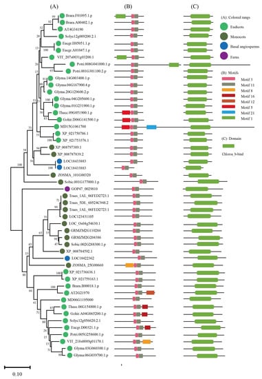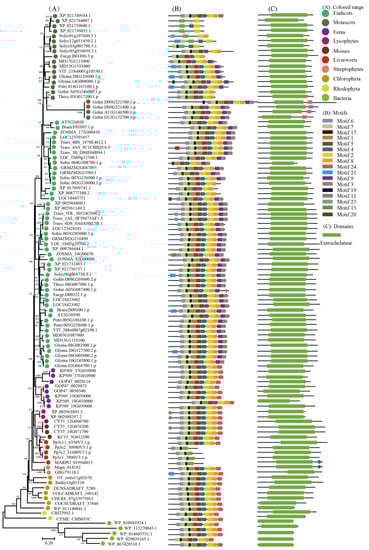 Phylogenetic evolutionary tree, protein motifs, and domains of the FCII subfamily members: (A) Unrooted phylogenetic tree of the FCII subfamily; (B) motifs of the FCII proteins. The different colors indicate seventeen motifs (left panel); (C) protein domains of the FCII genes.