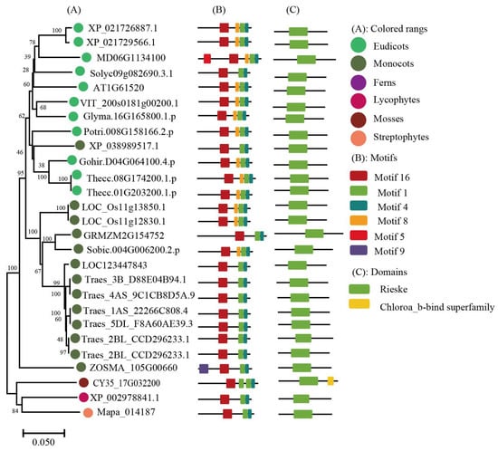Phylogenetic evolutionary tree, protein motifs, and domains of the PsbS subfamily members: (A) Unrooted phylogenetic tree of the PsbS subfamily; (B) motifs of the PsbS proteins. The different colors indicate nine motifs (left panel); (C) protein domains of the PsbS genes.