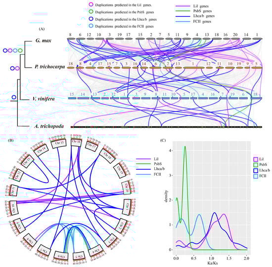 Duplication events of LHC genes in G. max. (A) Syntenic relationships of LHC genes among Glycine max, Populus trichocarpa, Vitis vinifera, and Amborella trichopoda; (B) syntenic relationships of LHC genes in Glycine max/ Glycine max; (C) distribution of Ka/Ks values among LHC genes in Glycine max.