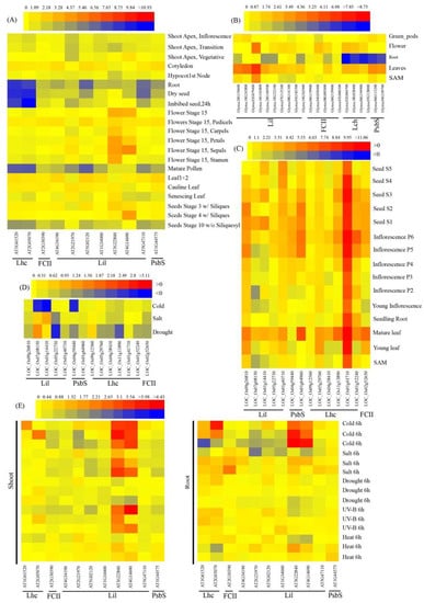 The results indicated that 18 LHC genes were expressed in leaf tissues, with a strong tissue-specific expression pattern. Lil genes were highly expressed in leaves, such as Glyma.16G163800.1.p, Glyma.04G249700.1.p, Glyma.03G262300.2.p, LOC_Os01g41710, and LOC_Os01g64960, suggesting that these genes have important functions in leaves. For the Lil gene in soybeans (Glyma.03G262300.2.p), the highest expression was detected in flowers, and the lowest expression was in the root, suggesting that this gene may play a key role in flower development (Figure 9A–C). A. thaliana Lil genes (AT4G14690 and AT3G22840) were highly expressed in shoot and root tissues under cold stress, and their expression levels were relatively high under salt and UV-B stress in shoot tissues (Figure 9D–E); however, the expression of these two genes was low under drought and heat stress. For LHC genes in rice, the expression was low under abiotic stress, among which LOC_Os07g08150, LOC_Os01g14410, and LOC_Os04g59440 had the lowest expression under cold stress, suggesting that these genes were functional in the plant response to these stimuli. LOC_Os01g41710 was expressed highly in tissues, with no significant change under abiotic stress.