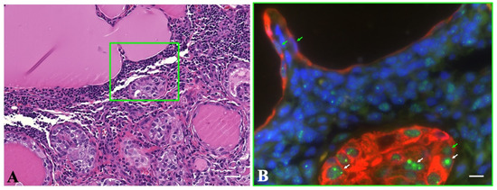Double immunofluorescence for p53-binding protein 1 (53BP1) (green) and pan-cytokeratin (AE1/AE3) (red) expression to detect follicular epithelium in a cervical lymph node from a papillary thyroid carcinoma (PTC) case. It exhibits both metastatic PTC (lower part) and thyroid follicular inclusion (TFI) without PTC-like nuclear features (NFs) (upper part) (A). In (B), surrounded by a green square in (A), a metastatic PTC shows the DNA damage response type with two or more discrete nuclear foci, whereas the TFI without PTC-like NFs shows a stable type and lymphocytes in the background. In (B), the white and green arrows indicate the DDR and stable types of 53BP1 expression, respectively. The scale bars indicate 30 µm and 10 µm in (A,B), respectively.