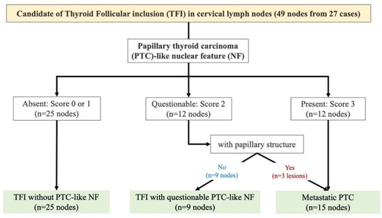 The status of nodal metastasis is crucial in determining the stage of well-differentiated thyroid cancer (WTC) in patients older than 55. Well-formed thyroid follicular inclusions (TFIs) are occasionally encountered in cervical lymph nodes (LNs) resected from patients with WTC [1,2], and it is difficult to determine whether they are true nodal metastases or ectopic thyroid tissues (ETTs) if they exhibit few papillary thyroid carcinomas (PTC)-like nuclear features (NFs). ETTs in cervical LN are reportedly found in 4.7 to 10% of autopsy cases without thyroid cancer [1,2,3], suggesting a nature other than metastatic carcinoma, yet aberrantly localized tissue is found in nodes during ontogeny. Thus, we are required to distinguish ETT from nodal metastasis in TFIs found in resected cervical LNs from patients with thyroid cancer.