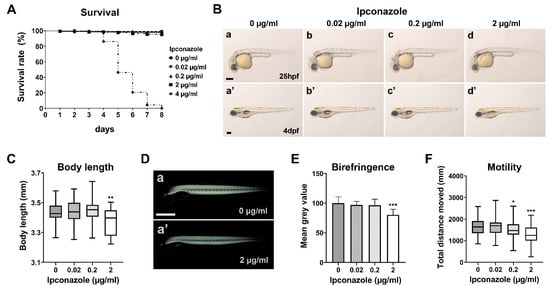 Ipconazole alters larval locomotive behavior in zebrafish development. (A) Survival rate (%) of zebrafish larvae treated with ipconazole, repeated six times (n = 300 each); (B) lateral views of the bright field imaging of the embryos at 25 h post fertilization (hpf) (a–d) and 4 days post fertilization (dpf) (a’–d’), repeated four times (n = 40 each), scale bar, 500 μm; (C) body length of the larvae treated with ipconazole at 4 dpf; (D) lateral views of 3-dpf larvae subjected to polarized light microscopy (a,a’), scale bar, 500 μm; (E) quantitation of the average birefringence of the larval muscle, repeated three times (n = 30 each); (F) locomotor activity of 6-dpf larvae treated with ipconazole. Graphical representation of the average distance traveled in the dark condition. * p < 0.05, ** p < 0.01, *** p < 0.001.