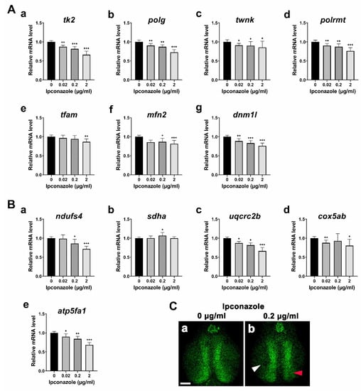 To understand the molecular basis underlying the developmental toxicity of ipconazole pesticides, we first monitored alterations of the gene expressions involved in mitochondrial genome maintenance. The following genes involved in the replication and transcription of mitochondrial DNA (mtDNA) were significantly reduced in the embryo treated with 0.02 μg/mL ipconazole, and further in those treated with higher concentrations (Figure 2A(a–d)): tk2 (thymidine kinase-2) for formation and maintenance of mtDNA, polg (mtDNA polymerase gamma) for mitochondrial genome replication, twnk (twinkle mtDNA helicase) for production and maintenance of mtDNA, and polrmt (RNA polymerase mitochondrial) for mitochondrial gene expression. In contrast, tfam (mitochondrial transcription factor A), an mtDNA transcription activator, was unaffected at 0.02 and 0.2 μg/mL but reduced at 2 μg/mL (Figure 2A(e)). According to the ipconazole-based disruption of mitochondrial DNA replication and transcription, we examined the alteration of genes involved in the fusion–fission cycle of mitochondria. A mitochondrial fusion marker, mfn2 (mitofusin 2), and a fission marker, dnm1l (dynamin-related protein 1), were found to be significantly reduced in the embryos treated with 0.02 μg/mL ipconazole and further in those treated with higher concentrations (Figure 2A(f,g)). Furthermore, the expression of components of the mitochondrial respiratory complex was assessed (Figure 2B(a–e)). Particularly, ndufs4 (NADH–ubiquinone oxidoreductase iron–sulfur protein 4 subunit) of mitochondrial respiratory Complex I was reduced in a concentration-dependent manner (Figure 2B(a)). However, sdha (succinate dehydrogenase) of Complex II was significantly increased only at 0.2 μg/mL, and uqcrc2b (ubiquinol–cytochrome c reductase core protein II) of Complex III was substantially reduced within the concentration range (Figure 2B(b,c)). Moreover, cox5ab (cytochrome c oxidase subunit 5Ab) of Complex IV was not considerably affected at 0.2 μg/mL but decreased at 0.02 and 2 μg/mL (Figure 2B(d)). Finally, atp5fa1 (ATP synthase mitochondrial F1 complex alpha subunit) of Complex V was severely reduced in a dose-dependent manner (Figure 2B(e)). Confocal imaging revealed a decrease in the mitochondrial density in the forebrain of the 3-dpf larvae treated with ipconazole (Figure 2C(a,b)). These results suggest that ipconazole disrupts mitochondrial biogenesis and function during zebrafish embryonic development.