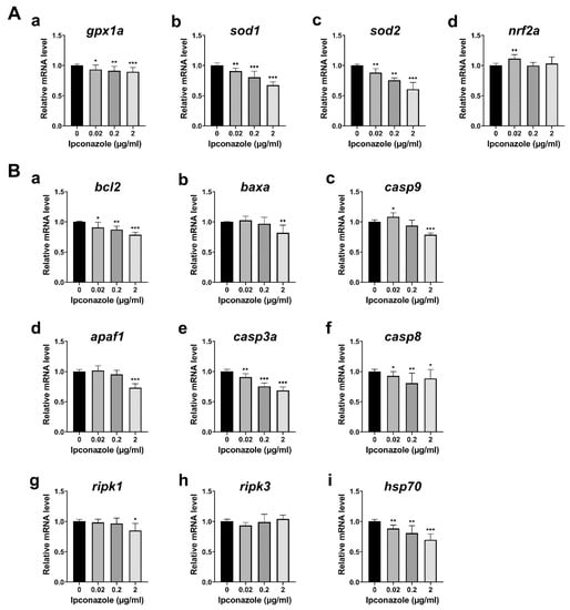 Ipconazole reduces expressions of antioxidant enzymes, caspases, and hsp70. (A) RT-PCR (real-time PCR) shows the antioxidant genes were reduced in the 28-hpf embryos treated with ipconazole at 0, 0.02, 0.2, and 2 μg/mL: gpx1a (a), sod1 (b) sod2 (c), and nrf2 (d); (B) mRNA expression of the apoptotic genes, bcl2 (a), baxa (b), casp9 (c), apaf1 (d), casp3a (e), and casp8 (f), and the necroptotic genes, ripk1 (g) and ripk3 (h), as well as the molecular chaperon hsp70 (i) were monitored. * p < 0.05, ** p < 0.01, *** p < 0.001.