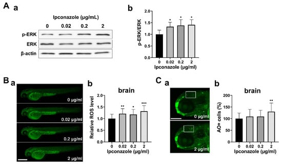 Ipconazole activates ERK1/2 signaling under oxidative stress. (A) Phosphorylation of ERK1/2 was increased in 28-hpf embryos treated with ipconazole. (a) Western blots using the antibodies against p-ERK, ERK, and β-actin proteins, respectively. (b) Graph of the quantitative analysis; (B) reactive oxygen species (ROS) were generated in the 48-hpf embryos treated with ipconazole. Scale bar, 500 µm. (a) Lateral views of the embryos subjected to DCFH-DA (2′,7′-dichlorodihydrofluorescein diacetate) staining and fluorescence imaging. (b) ROS level was quantitated by measuring the fluorescence intensity of ROS in the brain using the ImageJ software; (C) fluorescently labeled apoptotic cells in the brain (white box) of the 72-hpf ipconazole-treated embryos were counted using acridine orange staining. (a) Lateral views of the head subjected to acridine orange staining. Scale bar, 200 μm. (b) Graph of the quantitative analysis. * p < 0.05, ** p < 0.01, *** p < 0.001.
