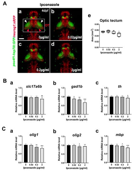 Ipconazole preferentially alters the development of GABAergic neurons. (A) Dorsal views of the brain of the 4-dpf larvae of Tg(pou4f1-hsp70l: GFP)rw0110b and Tg(-8.4neurog1:nRFP)sb3 transgenic fish using confocal microscopy (a–d) and the size analysis of the optic tectum in the embryos treated with ipconazole (e). White box, optic tectum (OT); white arrowhead, neuropil; red arrowhead, periventricular layer, scale bar, 100 μm; (B) mRNA expressions of the following neuronal markers in the 3-dpf embryos using RT-PCR: slc17a6b for excitatory glutamatergic neurons (a), gad1b for GABAergic inhibitory neurons (b), and th for dopaminergic neurons (c); (C) mRNA expressions of the following glial cell markers: olig1 and olig2 for oligodendrocyte formation (a,b) and mbp for myelination (c) in the 3-dpf embryos. * p < 0.05, ** p < 0.01, *** p < 0.001.
