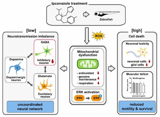 Potential mechanism of neurodevelopmental toxicity of ipconazole pesticide in zebrafish. The zebrafish embryos treated with ipconazole generate ROS and show evidence of dose-dependent mitochondrial dysfunction and ERK1/2 activation. Ipconazole specifically inhibited the development of GABAergic inhibitory neurons at low doses. In contrast, glutamatergic and dopaminergic neurons remained unaffected, possibly disrupting the interplay among the major neurotransmission systems and uncoordinated neural functions in the central nervous system. High concentrations of ipconazole cause cell death in neuronal and muscle development, reducing the motility and survival of embryos. *** p < 0.001.